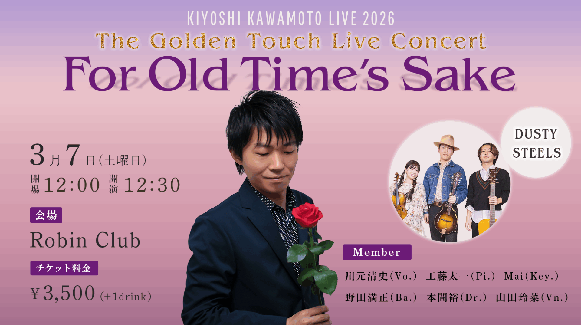 ロマンティックに溢れた心暖まるステージで華やかに彩る。スムース・ジャズ~AORの枠を超えて華やかに活動するKiyoshi Kawamoto。クラシックとフィドルの流れを汲む山田玲菜率いるDUSTY STEELS。幅広い音楽ファンを魅了するふたりが、ロビンクラブ表参道で待望の共演を果たす。アメリカンミュージックの過去と現在が響き合い、深みのあるサウンドとともに体感する特別なステージに胸が高まる。